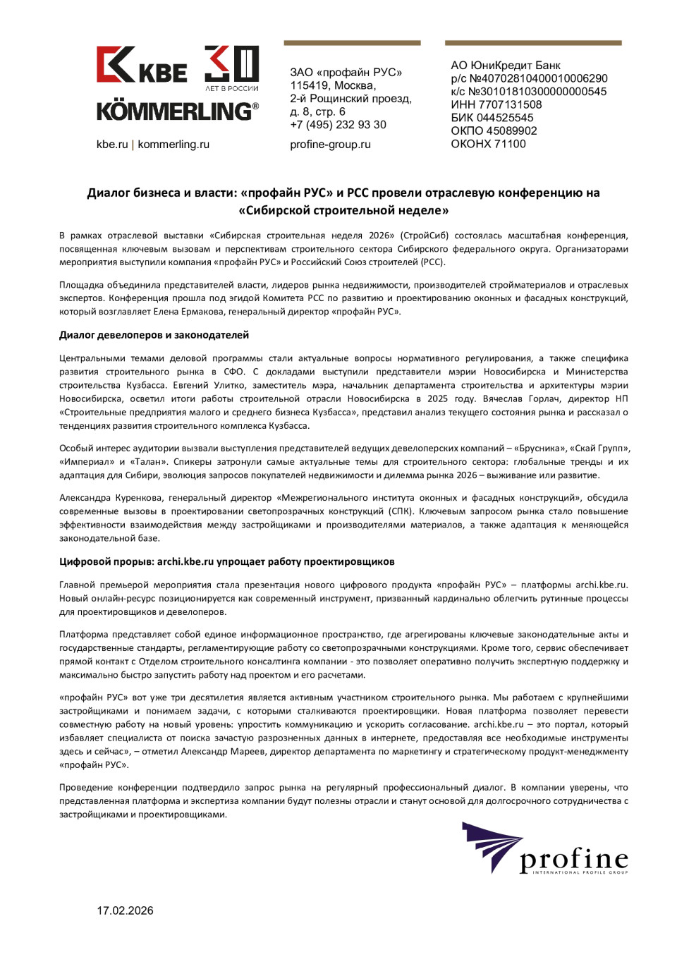 «профайн РУС» вот уже три десятилетия является активным участником строительного рынка. Мы работаем с крупнейшими застройщиками и понимаем задачи, с которыми сталкиваются проектировщики. Новая платформа позволяет перевести совместную работу на новый уровень: упростить коммуникацию и ускорить согласование. archi.kbe.ru — это портал, который избавляет специалиста от поиска зачастую разрозненных данных в интернете, предоставляя все необходимые инструменты здесь и сейчас», — отметил Александр Мареев, директор департамента по маркетингу и стратегическому продукт-менеджменту «профайн РУС».