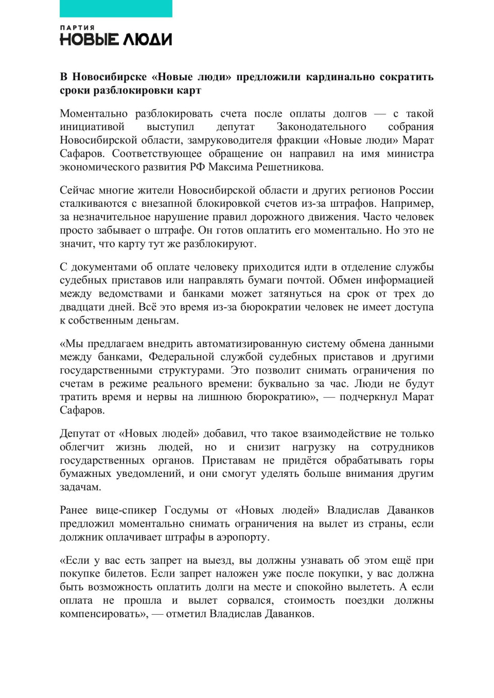 «Мы предлагаем внедрить автоматизированную систему обмена данными между банками, Федеральной службой судебных приставов и другими государственными структурами. Это позволит снимать ограничения по счетам в режиме реального времени: буквально за час. Люди не будут тратить время и нервы на лишнюю бюрократию», — подчеркнул Марат Сафаров.
