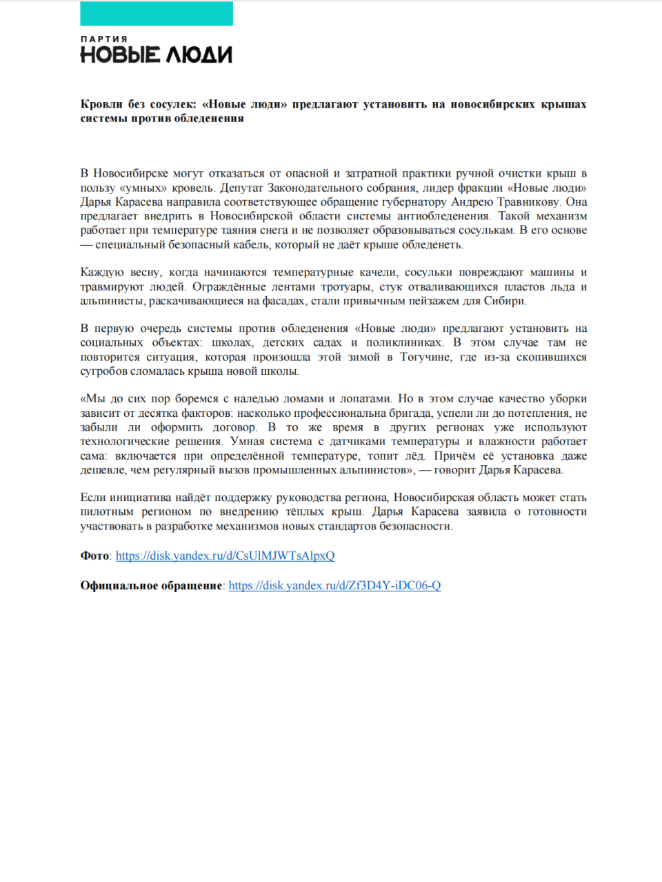 Депутат Законодательного собрания, лидер фракции «Новые люди» Дарья Карасева направила соответствующее обращение в профильное министерство. Она предлагает внедрить в Новосибирской области системы антиобледенения. Такой механизм работает при температуре таяния снега и не позволяет образовываться сосулькам. В его основе — специальный безопасный кабель, который не дает крыше обледенеть.