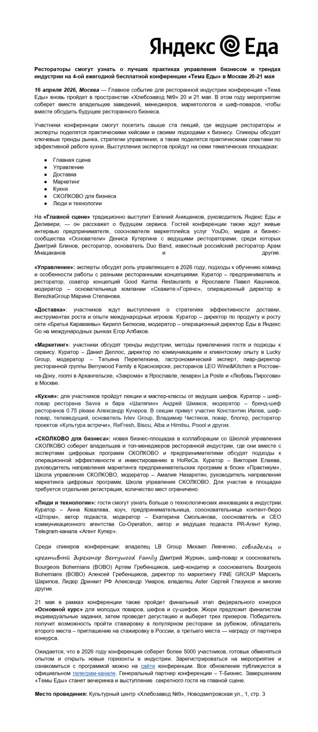 Главное событие Яндекс Еды для ресторанной индустрии конференция «Тема Еды» вновь пройдет в пространстве «Хлебозавод № 9» на Новодмитровсковской улице 20 и 21 мая. В этом году мероприятие соберет вместе владельцев заведений, менеджеров, маркетологов и шеф-поваров, чтобы вместе обсудить будущее ресторанного бизнеса.